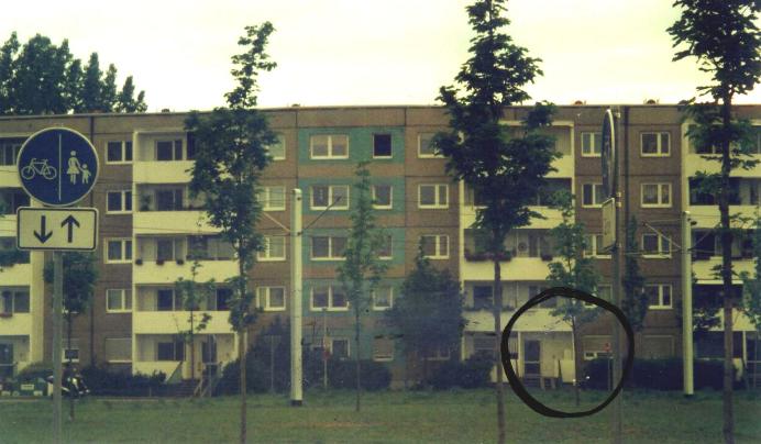 Straßenbahnen 2, 9, 10, 11 bis Haltestelle Eselsmühle, dann in Fahrtrichtung auf den Fünfgeschosser zu